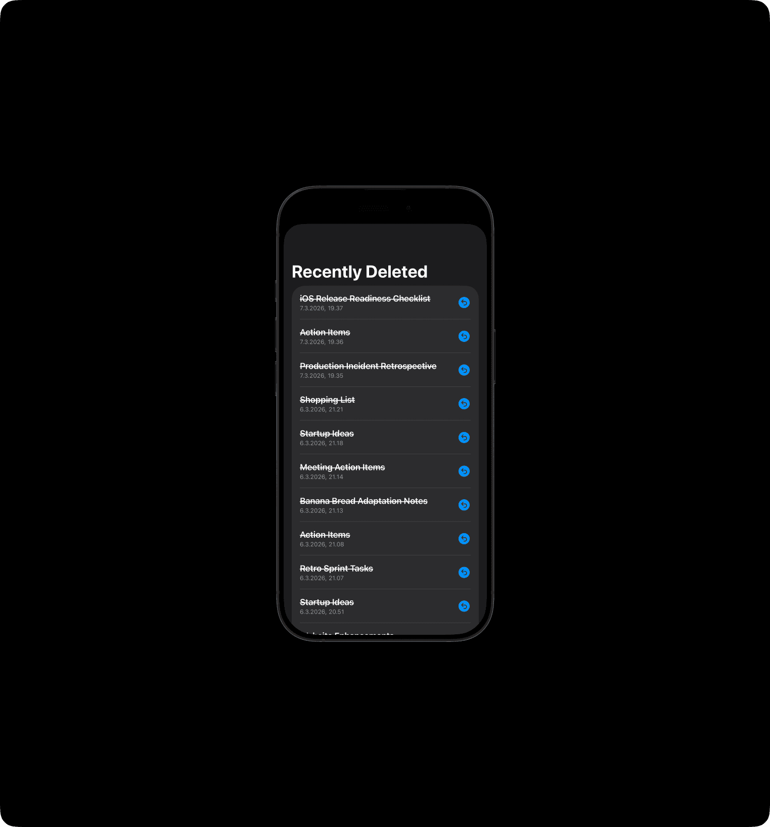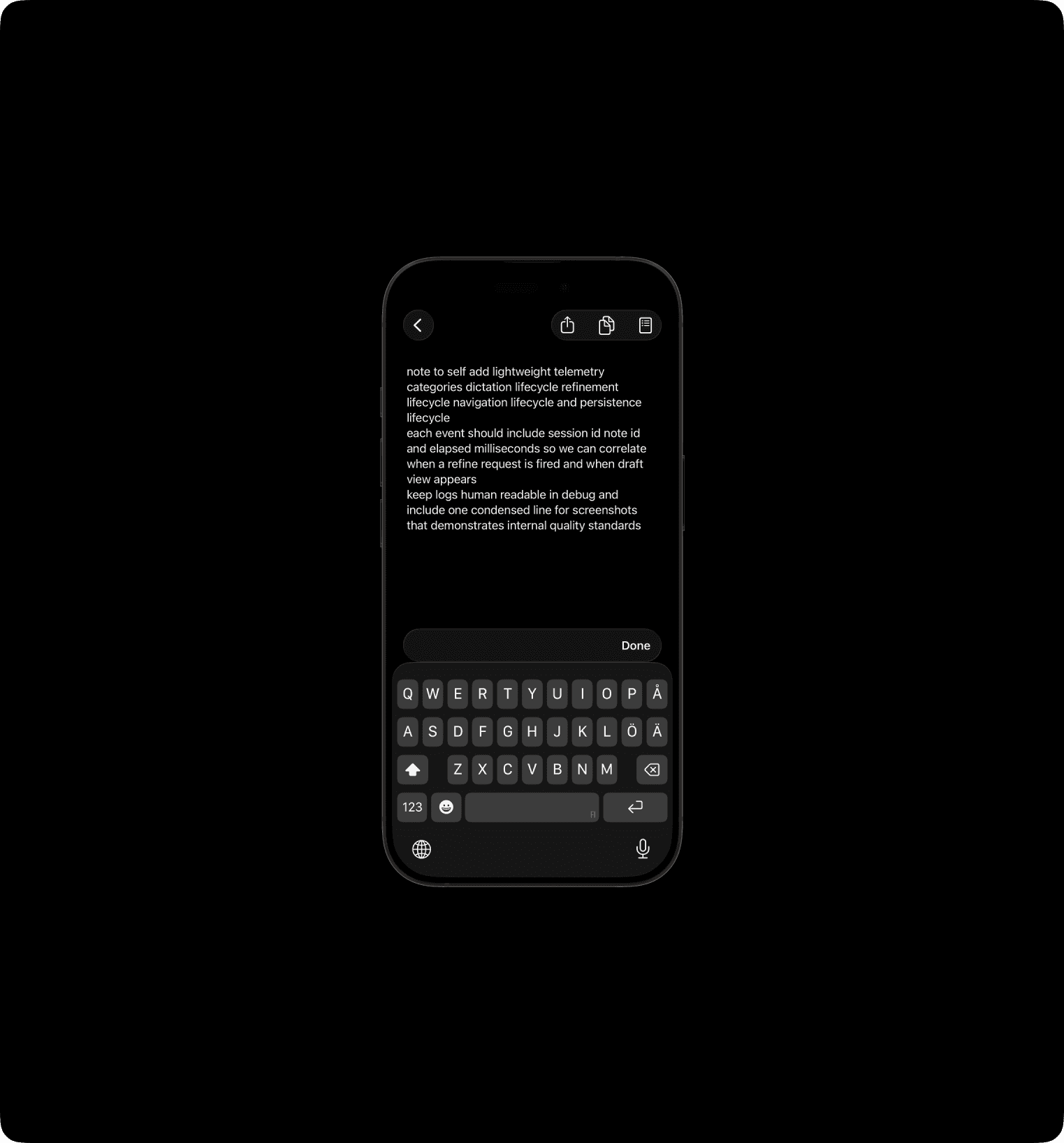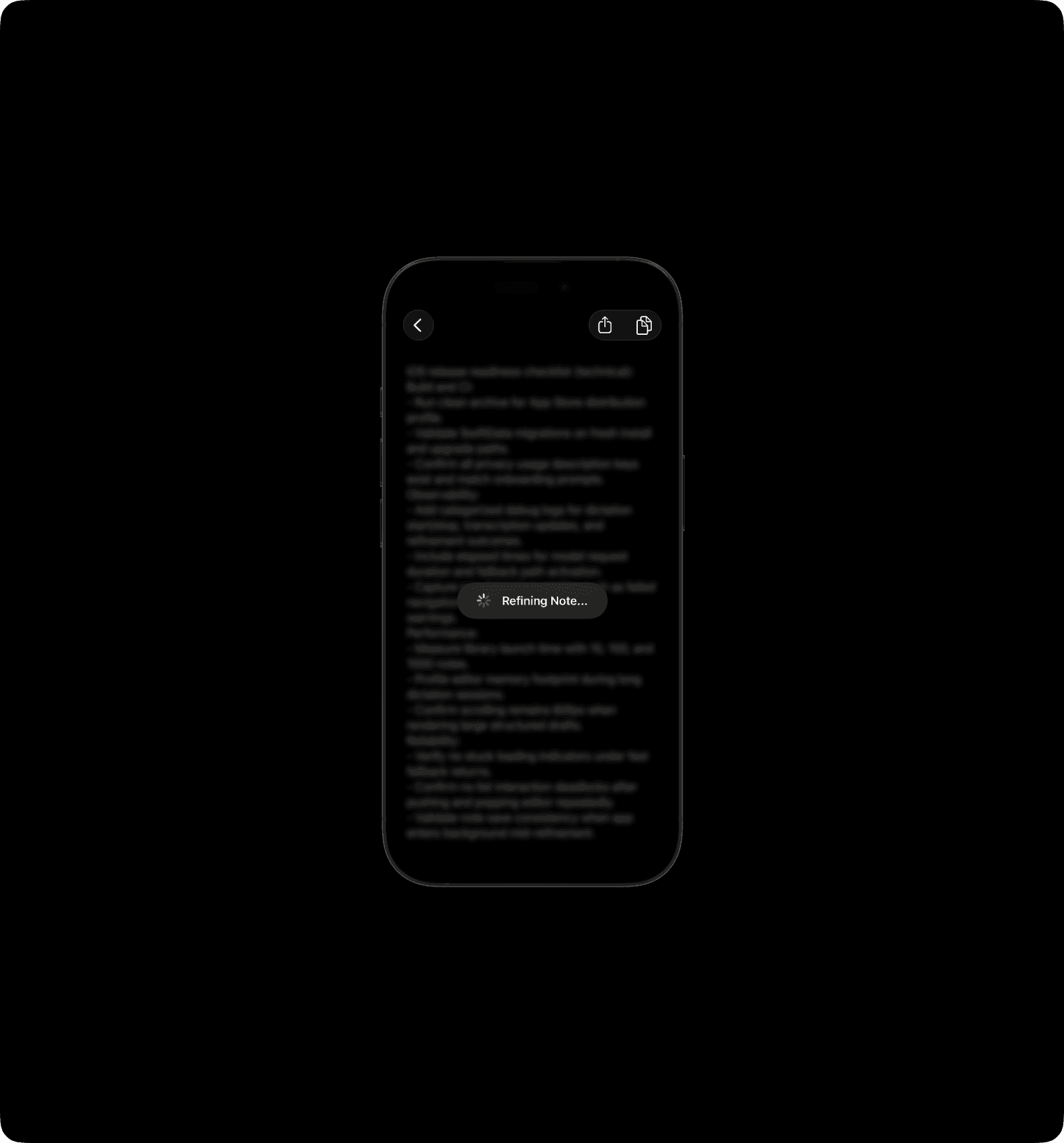 All processing stays on your iPhone. No cloud. No data harvesting. Your voice and your notes remain 100% private—always.